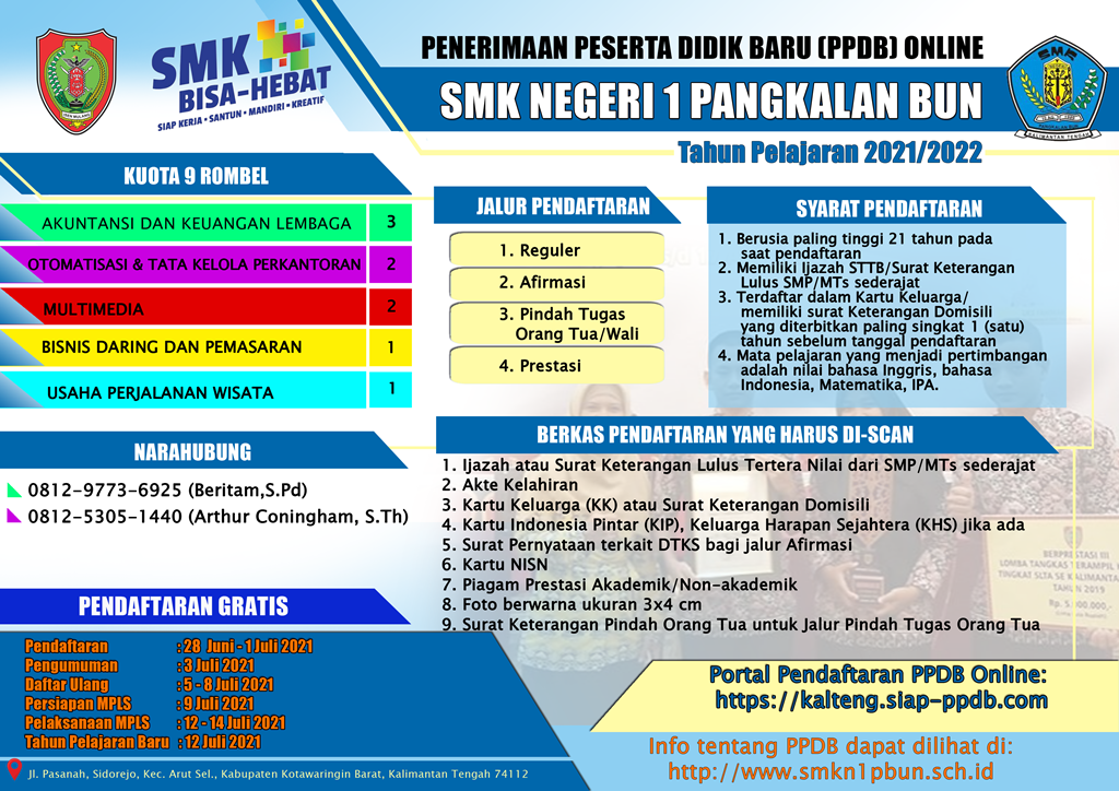 Info Berkaitan dengan Penerimaan Peserta Didik Baru SMK Negeri-1 Pangkalan Bun Tahun Pelajaran 2021 - 2022 Dapat Di lihat Pada Pamplet di bawah ini :