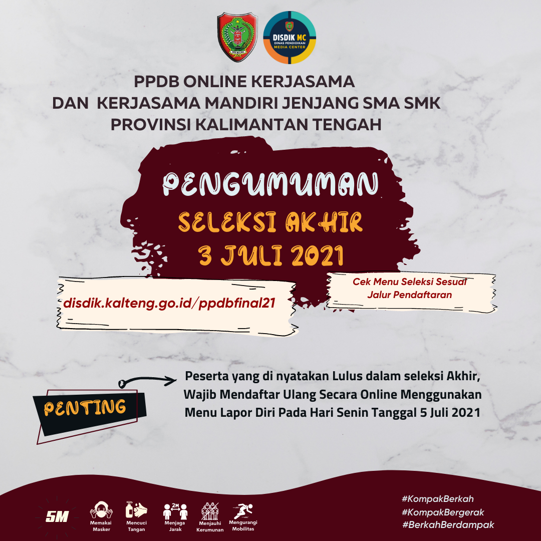 Daftar Ulang Dilakukan secara Online melalui link web : disdik.kalteng.go.id/ppdbfinal21