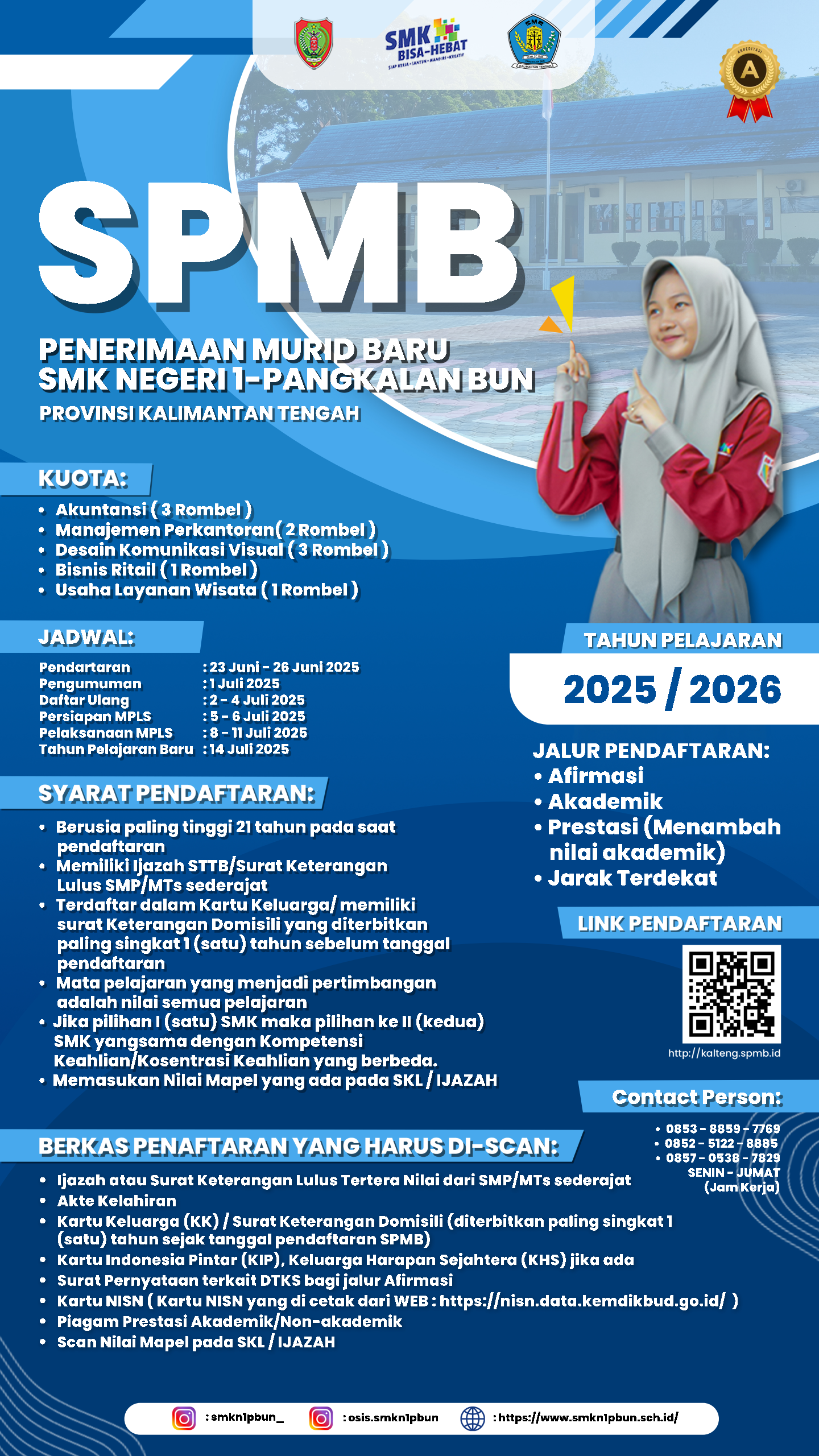 CATATAN : Diberitahukan Kepada Calon Peserta Didik Baru SMK Negeri-1 Pangkalan Bun. Pada Hari Senin, 23 Juni 2025 WAJIB Hadir Ke SMK Negeri-1 Pangkalan Bun untuk mengikuti Sosialisasi Teknis Pendaftaran Online SPMB 2025 pada pukul 07.00 WIB Menggunakan Seragam Sekolah SMP masing-masing.