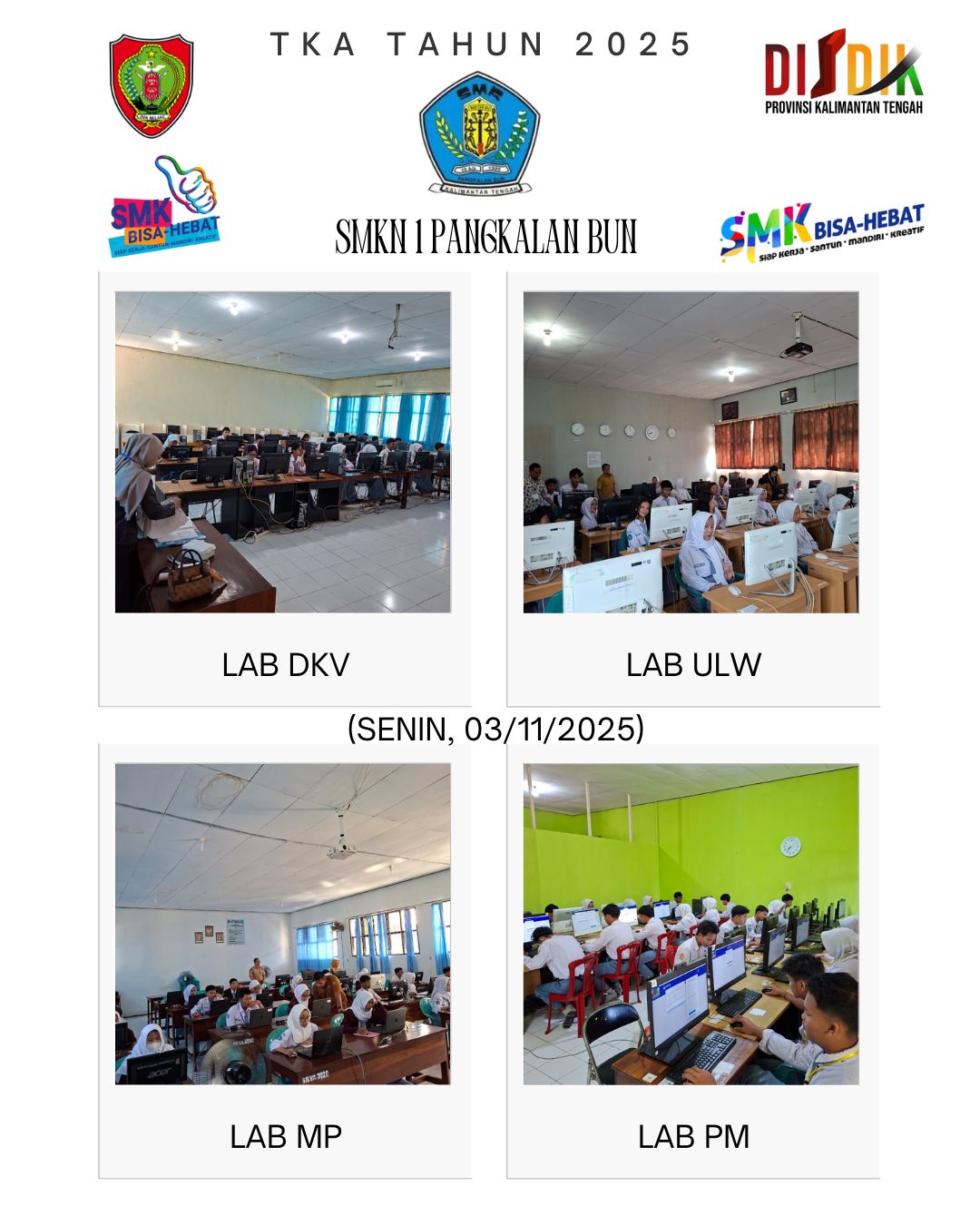 SMKN 1 Pangkalan Bun baru selesai melaksanakan kegiatan Tes Kemampuan Akademik (TKA) Tahun 2025. Kegiatan TKA di SMKN 1 Pangkalan Bun diikuti oleh seluruh murid (283 murid) yang di ikuti dalam 1 gelombang, yaitu gelombang pertama dilaksanakan pada tanggal 3–4 November 2025, Pada hari pertama, TKA menguji mata pelajaran wajib, Bahasa Indonesia, Matematika Umum, dan Bahasa Inggris. Sedangkan pada hari kedua menguji dua (2) mata pelajaran pilihan yang dipilih siswa.
